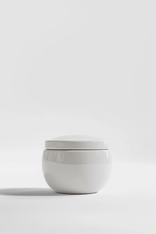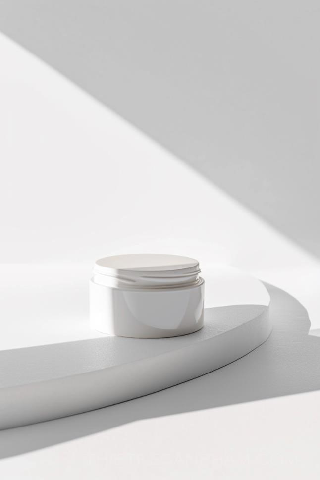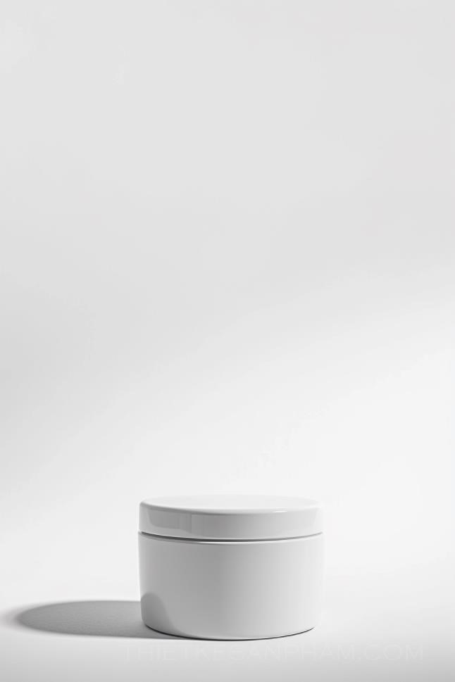 A clean and professional commercial mockup featuring a cream container elegantly presented on a solid white background. The composition highlights the container as the focal point, allowing for clear visibility and emphasis on branding or design elements. The white background provides a minimalist and versatile backdrop, suitable for various product presentations. Types of Lights: Soft and even lighting illuminates the cream container, creating a well-balanced and visually appealing scene. Global Illumination and Shadows play a role in defining the contours of the container and adding depth to the mockup. The lighting technique involves capturing the simplicity and sophistication of the commercial presentation. --ar 2:3 --s 50 --v 6.0 --style raw