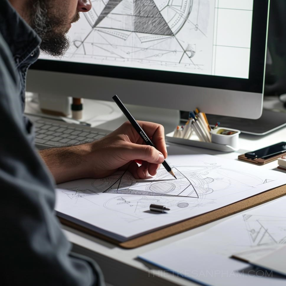 PROMPT: A man's hand draws a pyramid design on paper in pencil, a computer and notebook and drawings on his desk, realistic , 4K cinematic --v 6.0