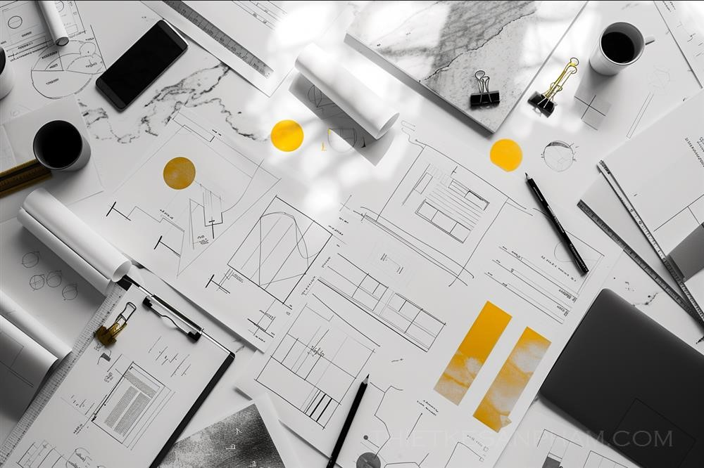 PROMPT: minimal illustration, topview, drawing table, illustration style, architectural solar studies, documents, research, black and white with grey tones and only some gold accents --ar 3:2 --v 6.0