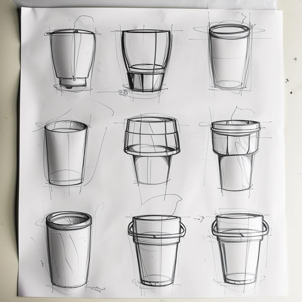 PROMPT: contact sheet with 9 rough sketches of a stanley tumbler product design --s 50 --v 6.0