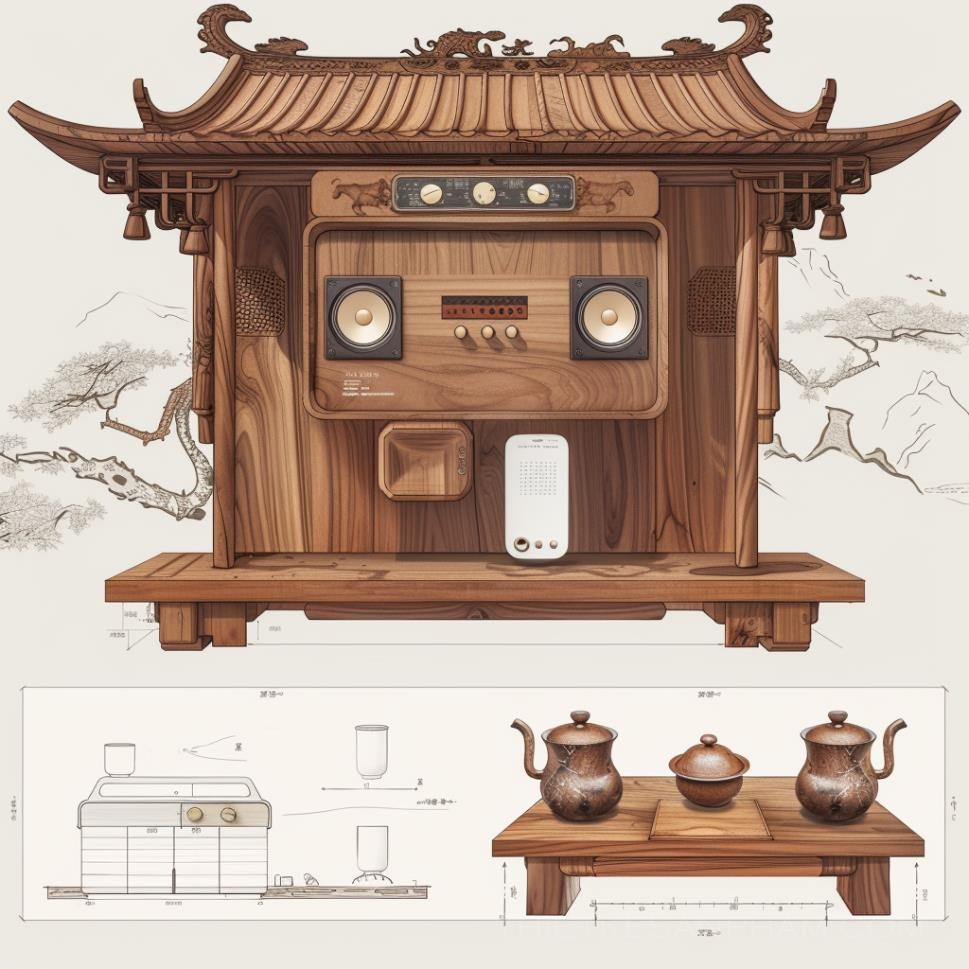 The combination of Tie Guan Yin and sound system is a cultural and creative product of tea culture. Front view, side view, flat plan, product design drawing. Industrial production style., 4K --v 6.0