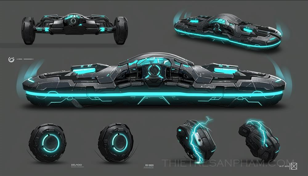 Bảng thiết kế đầy đủ của xe trượt không gian siêu công nghệ mang phong cách cyber punk, bao gồm các chi tiết kim loại và ánh sáng neon.