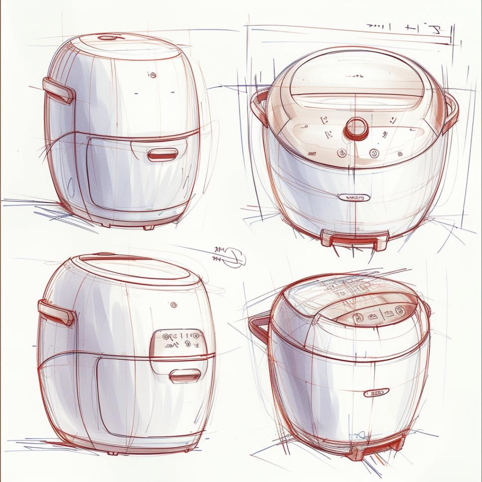 industrial design idea sketch of rice cooker, marker rendering, modern, dieter rams style, minimalistic, multiple views, White background --v 6.0