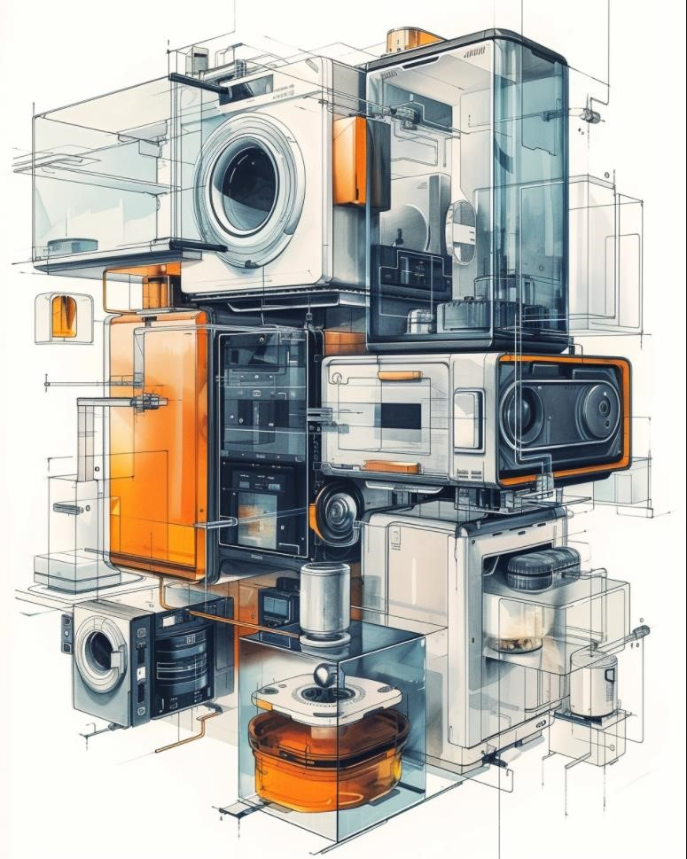 a drawing showing several of the many types of appliances in use today, in the style of light gray and light amber, futuristic realism, environmentally inspired, transportcore, polished craftsmanship, transparent layers, dark white and light orange --ar 87:109 --s 250 --v 6.0