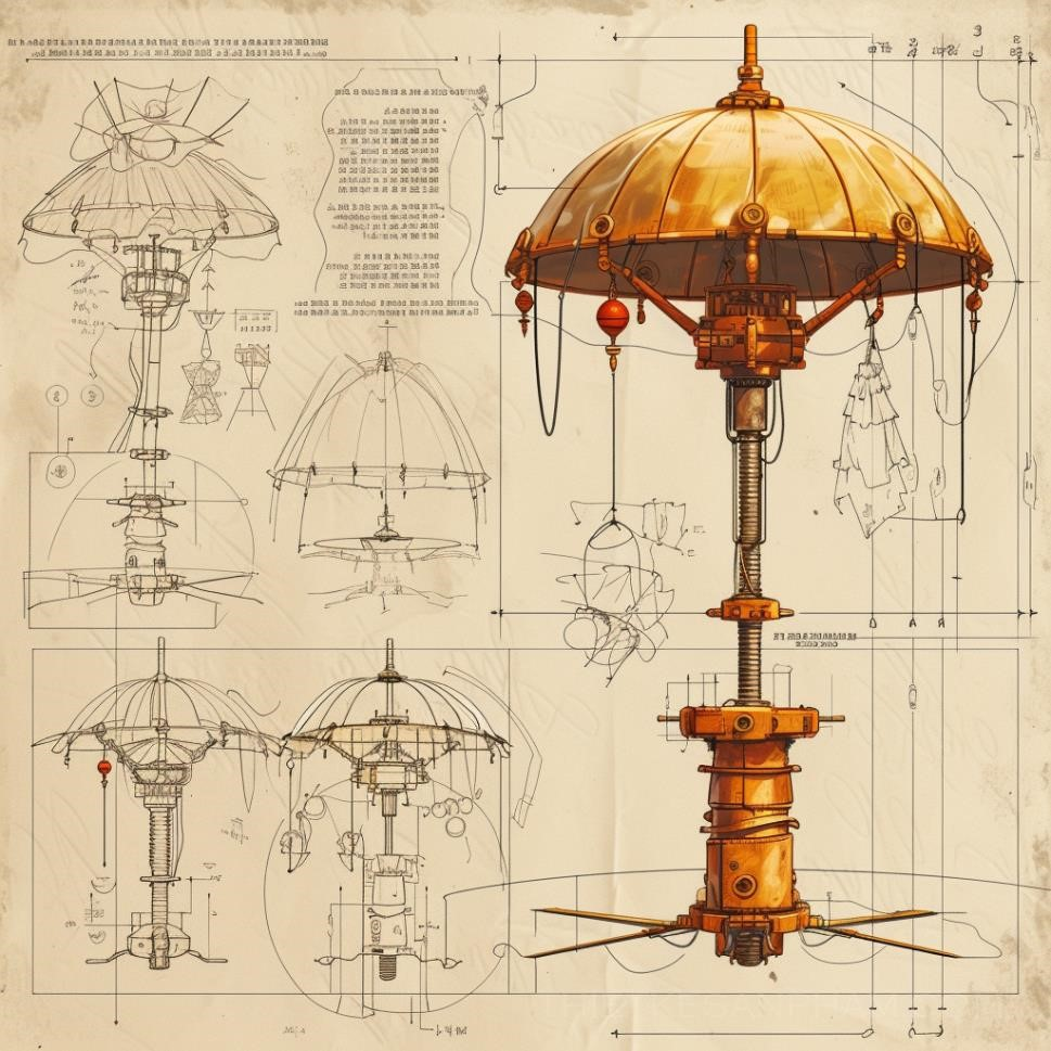 "Bút chì trên tấm vẽ nghệ thuật đang vẽ nhiều góc độ khác nhau của cấu trúc dù cánh, cấu trúc telescopi, cấu trúc xương sườn, cấu trúc chiếu sáng. Bút mực đang tạo nét chữ và ghi chú các cấu trúc chi tiết, hộp thư, chi tiết siêu thực, các hình dạng đùa nghịch, màu sắc đa dạng. Bút màu đang tô màu và tạo chi tiết đậm đà, tạo bản thiết kế cấu trúc chi tiết và bản tóm tắt đầy đủ."
