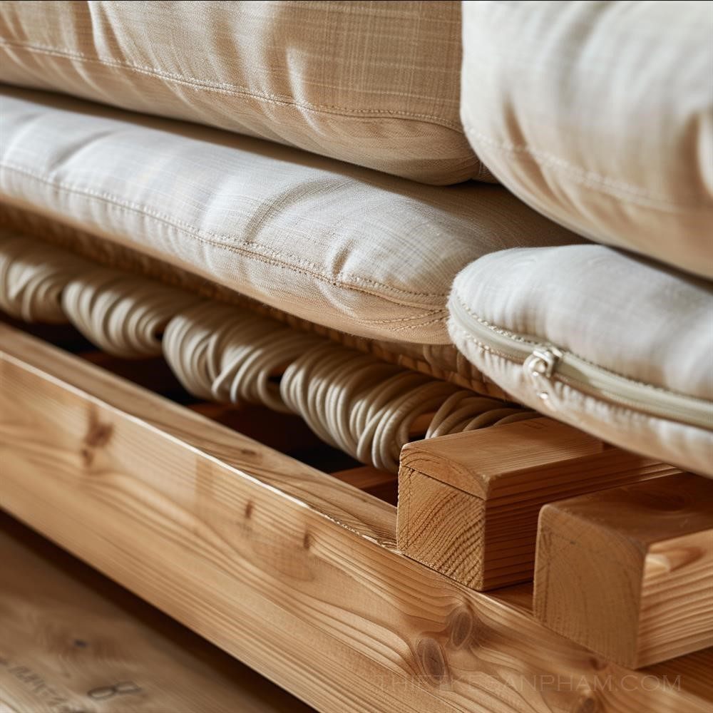 Tạo một bộ ảnh chất lượng cao để trưng bày cấu trúc nội bộ độc đáo của một chiếc sofa. Các hình ảnh nên tập trung vào những đặc điểm sau: Một bức ảnh chi tiết về khung gỗ, rõ ràng hiển thị những lò xo nosag bị căng; Một bức ảnh macro tập trung vào sự sắp xếp của lõi lò xo Bonell, được buộc chặt với lò xo nosag; Một bức ảnh mô tả vị trí của lõi lò xo túi được lắp đặt phía trên lõi lò xo Bonell; Một bức ảnh nổi bật về lớp đệm bọt cuối cùng làm nền cho sofa; Những hình ảnh bổ sung tập trung vào những tính năng đột phá của lõi lò xo Bonell, chứng minh khả năng phản ứng thông minh với những áp lực khác nhau; Một góc nhìn toàn diện về chiếc sofa hoàn thiện, trưng bày thiết kế sang trọng và cấu trúc nội bộ; Đảm bảo mỗi bức ảnh tạo nên bầu không khí độc đáo và tinh tế của chiếc sofa, với độ phân giải cao và chi tiết thực tế.