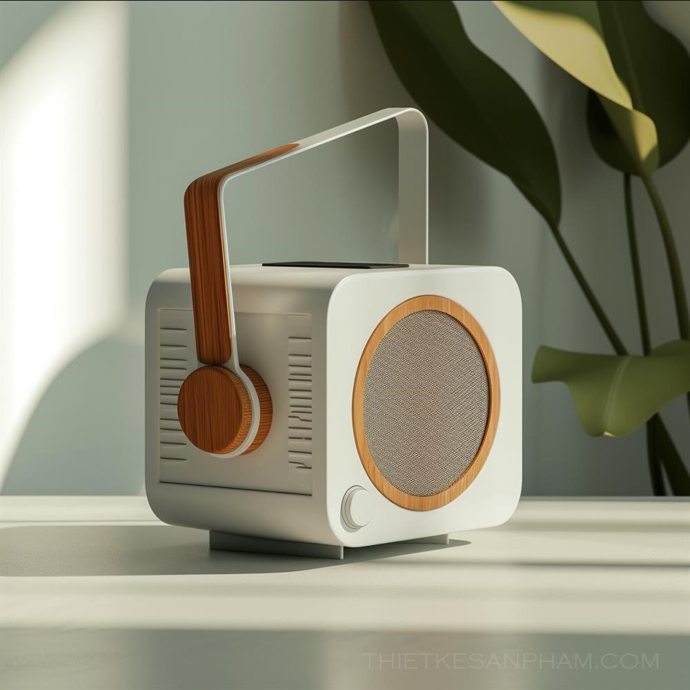 Gần tương lai, thêm sắc sảo hơn, tay cầm gỗ bên cạnh, Đài radio sạc bằng gió theo phong cách tối giản, với tay quay xoay bên cạnh, hình ảnh sản phẩm trong căn nhà hiện đại tối giản, dự án kỹ thuật thiếu niên tùy ý.