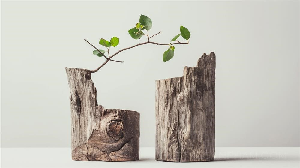 Hai đốt gỗ chặt sát nhau, một cành có lá xanh, hoa, trong phong cách gốm tối giản, lấy cảm hứng từ phương Đông, kỹ thuật ghép ảnh, hình ảnh tối giản và tinh tế của động vật và thực vật, gợi lên sự đơn giản và tinh tế.