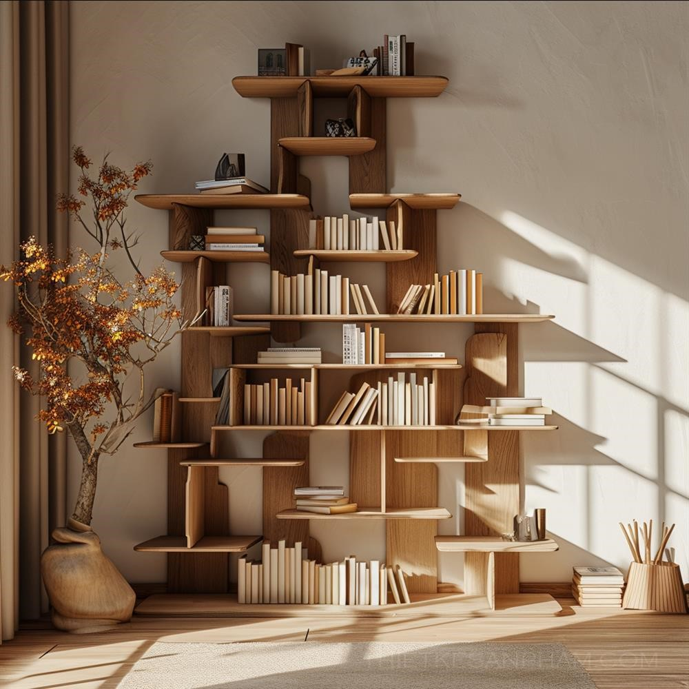 Một kệ sách được tạo bởi phương pháp ghép nối của con lười bằng cách sử dụng kỹ thuật ghép hình 3D, thiết kế đơn giản, tối giản, bằng gỗ, ánh sáng toàn cầu và phân tích tia chớp bằng động cơ Unreal.