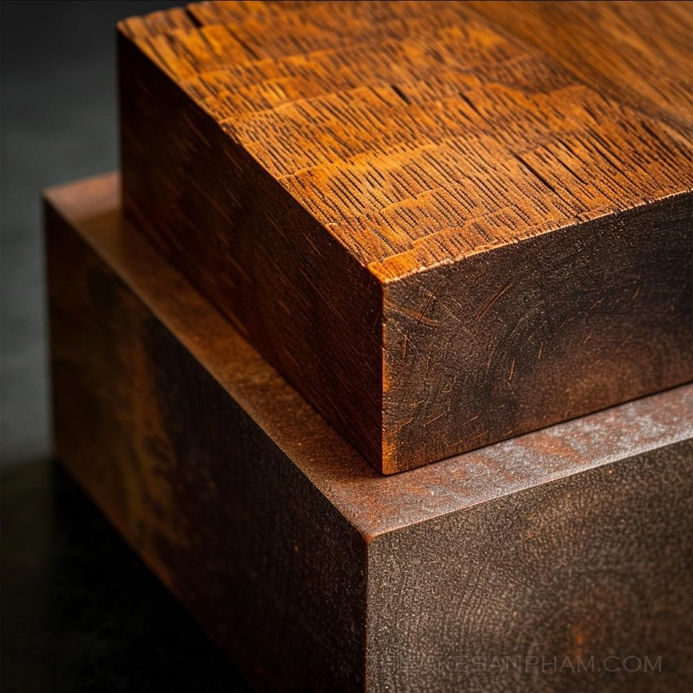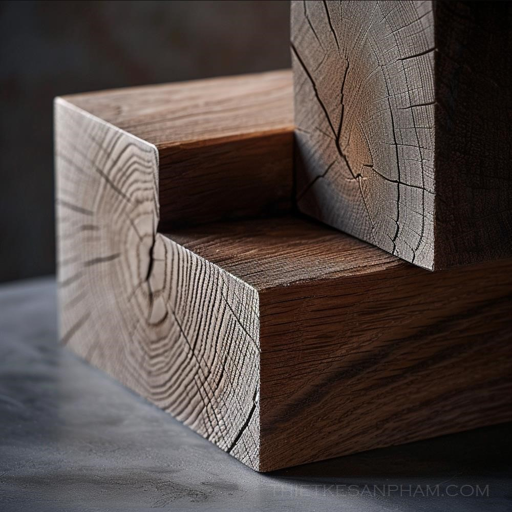 Hai mảnh gỗ hoàn hảo khớp với nhau tại góc bàn, tạo nên một bức ảnh hài hòa về hình học, được chụp trong studio với ánh sáng tinh tế, gần gũi và chi tiết sắc nét.