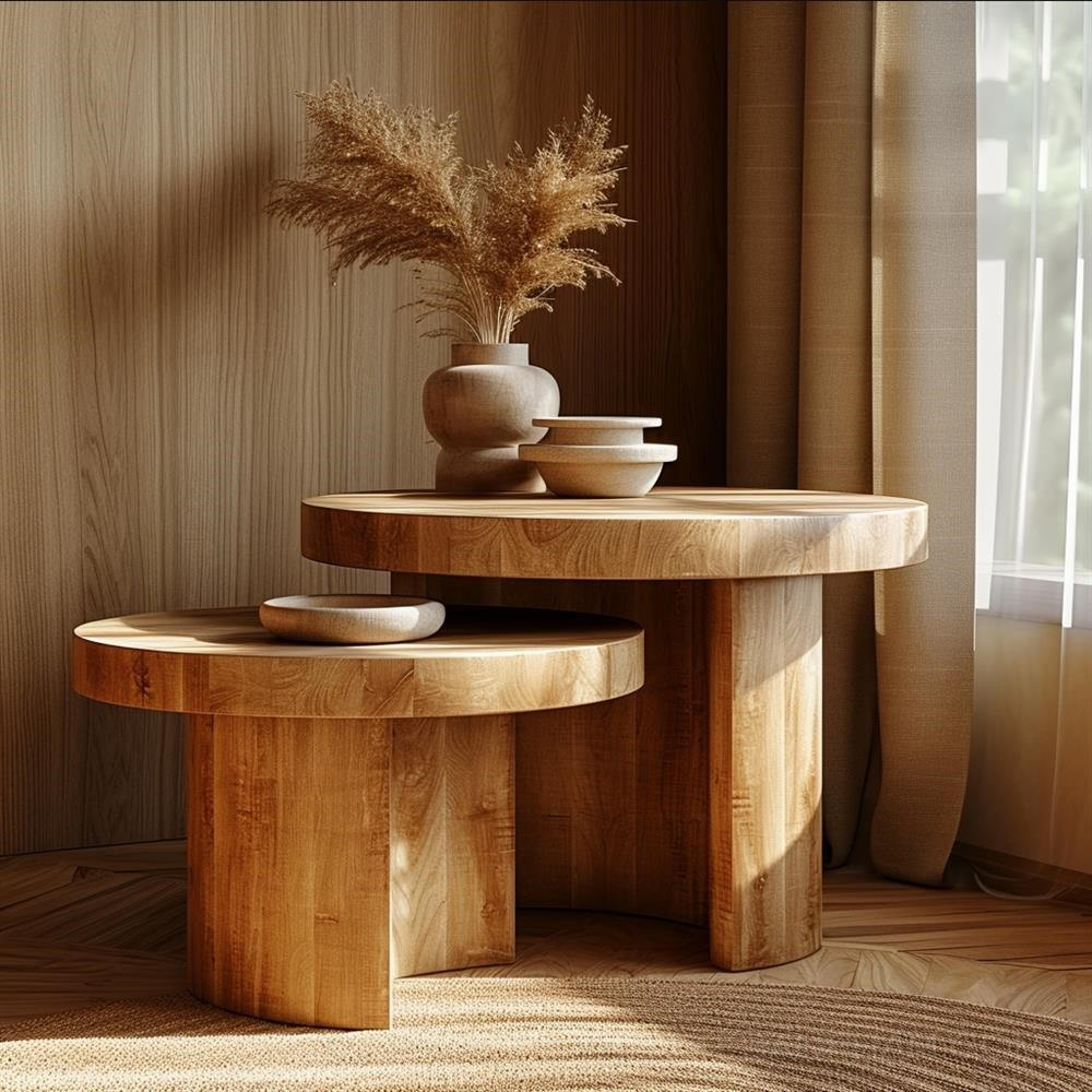 a pair of wooden tables with round tops, in the style of evgeni gordiets, dark beige, minimalist figures, matte photo, christcore, kati horna, vray tracing --v 6.0 --s 750 --style raw