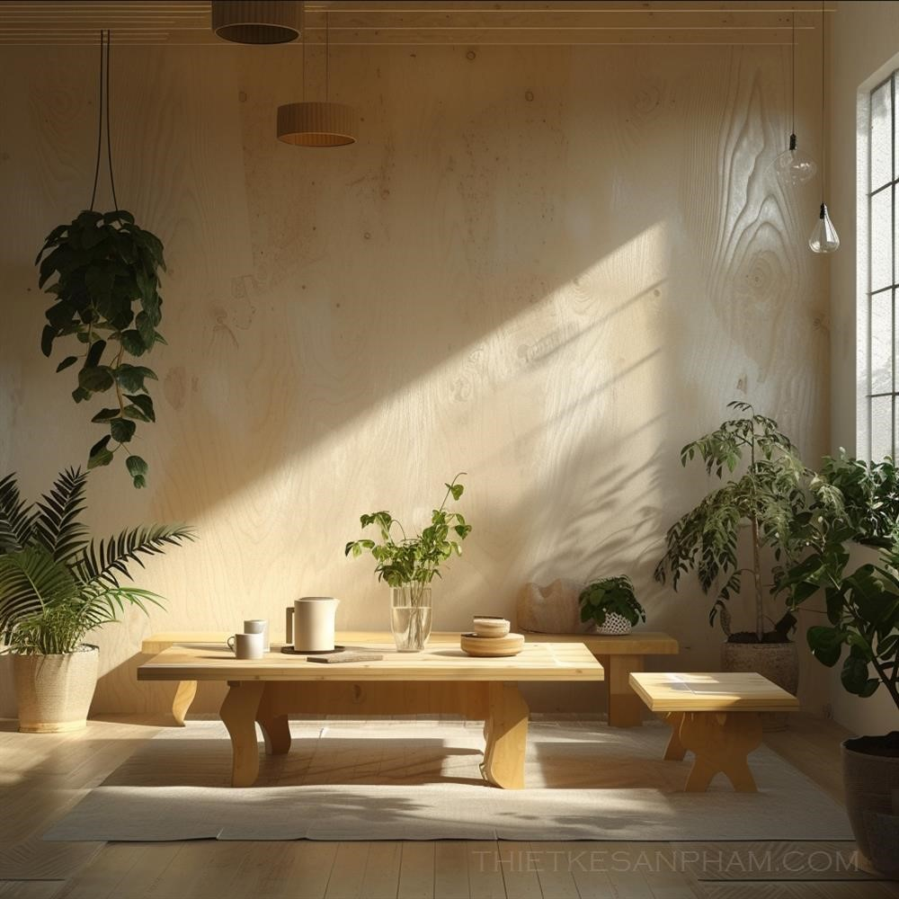 Nội thất nhà bằng gỗ dán, được trang trí bằng cây cảnh tạo nên không gian trong lành và siêu thực, chất lượng hình ảnh 4k.
