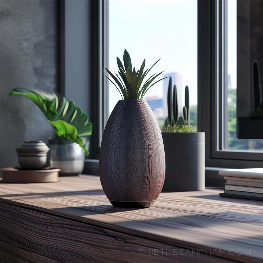 iết kế sản phẩm hiện đại cho một loa thông minh với chất liệu gỗ sẫm màu giống như một bình hoa trên bàn làm việc với những cửa sổ phía sau và cây cối. Bức ảnh thể hiện ánh sáng tự nhiên và tạo cảm giác gần gũi với thiên nhiên.
