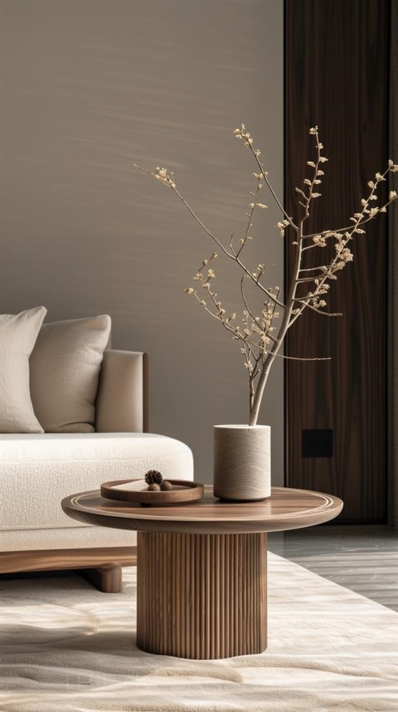Envision Japandi-style Center tables for Midjourney, inspired by japandi style, incorporating clean lines, chiseled or fluted wood textures, and the addition of rattan or other materials. Strive for a seamless blend of Japanese and Scandinavian aesthetics, emphasizing quality craftsmanship, functionality, and simplicity. Create bedside tables that not only contribute to the serene and elegant atmosphere but also introduce a tactile and inviting touch through the incorporation of diverse textures --ar 9:16 --style raw --v 6.0