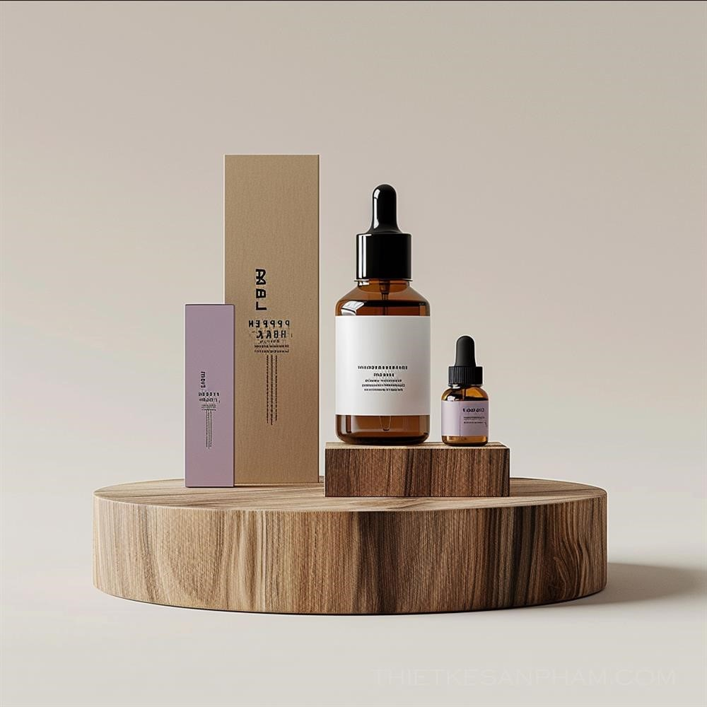 Tạo một hình ảnh của một trưng bày sản phẩm tinh tế và tối giản cho một thương hiệu cao cấp. Thiết lập cần bao gồm một bệ đỡ tròn bằng gỗ trên nền trang trí màu trung tính. Có hai sản phẩm, một chai thủy tinh màu hổ phách nhỏ với nhãn trắng, thiết kế chữ LAVENDER với font chữ tinh tế, và một chai xịt có thiết kế tương tự nhưng nhãn ghi là PEPPERMINT HAKKA. Bên cạnh các chai, bao gồm các hộp đựng sản phẩm tương ứng đứng thẳng, với thiết kế sạch sẽ và sang trọng thể hiện bản chất tự nhiên và chất lượng cao của sản phẩm. Tổng thể sẽ truyền tải một cảm giác sang trọng, sạch sẽ và đơn giản.