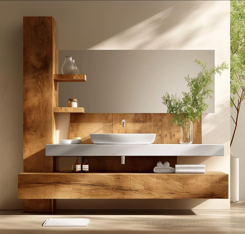 modern bathroom vanity unit with mirror and shelves, in the style of minimalist tendencies, light brown and white, limited color range, layered surfaces --ar 51:49 --stylize 250 --v 6.0