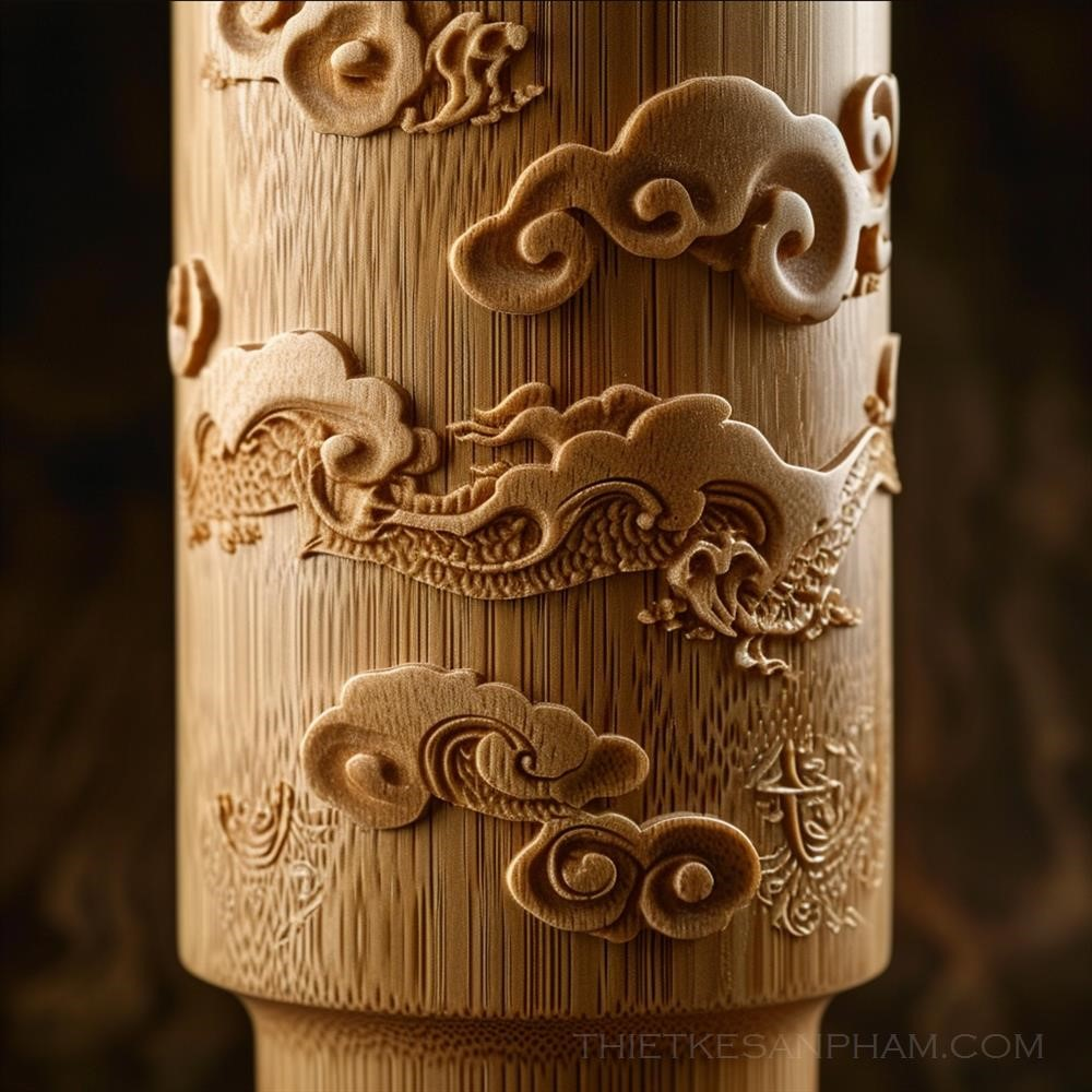 On dark background, three-dimensional wood carving cylinder, bamboo tube, traditional Chinese cloud pattern, regular, delicate, oriental minimalism, masterpiece, light wood color, master, rich details, photography --v 6.0